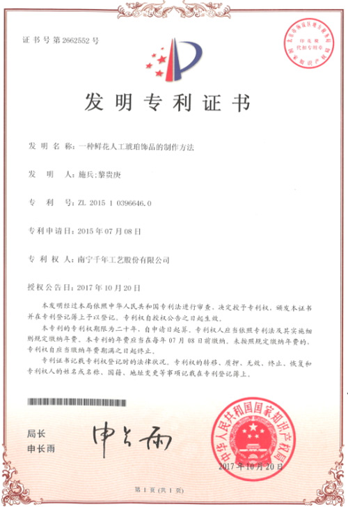 《一種鮮花人工琥珀飾品的制作方法》該發(fā)明提供一種鮮花人工琥珀飾品的制作方法,千年工藝生產(chǎn)的“千帆”品牌包埋標(biāo)本采用該發(fā)明的技術(shù)方案,使得鮮花在凍干之后仍然保持原有的顏色和形態(tài),樹脂包埋之后花朵仍然保持原有的顏色和形態(tài),且包埋制得的標(biāo)本在使用過程中,花朵也不隨著光線照射而變黃或褪色。