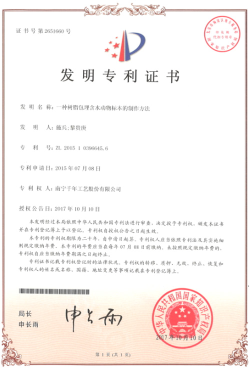 《一種樹脂包埋含水動(dòng)物標(biāo)本的制作方法》該發(fā)明提供了一種樹脂包埋含水動(dòng)物標(biāo)本的制作方法。千年工藝生產(chǎn)的“千帆”品牌包埋標(biāo)本采用該發(fā)明的技術(shù)方案,使得包埋在樹脂中的標(biāo)本形態(tài)顏色逼真,標(biāo)本表面沒有起霧等質(zhì)量問題;包埋樹脂沒有起霧,渾濁現(xiàn)象;樹脂透明度高,能夠清晰觀察到標(biāo)本各個(gè)細(xì)節(jié);長(zhǎng)時(shí)間使用,樹脂不變黃,標(biāo)本不腐敗。