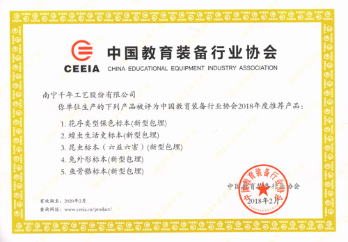 通過專家評委層層篩選,南寧千年工藝股份有限公司生產(chǎn)的“千帆”品牌新型包埋標(biāo)本:花序類型保色標(biāo)本(新型包埋)、蝗蟲生活史標(biāo)本(新型包埋)、昆蟲標(biāo)本(六害六益)(新型包埋)、兔外形標(biāo)本(新型包埋)、魚骨骼標(biāo)本(新型包埋),共5款產(chǎn)品榮獲中國教育裝備行業(yè)協(xié)會2018年度推薦產(chǎn)品。