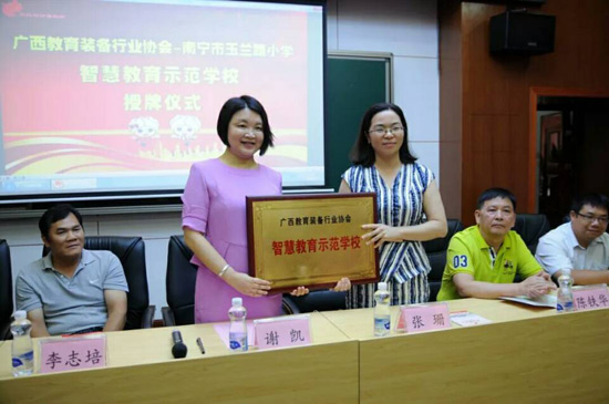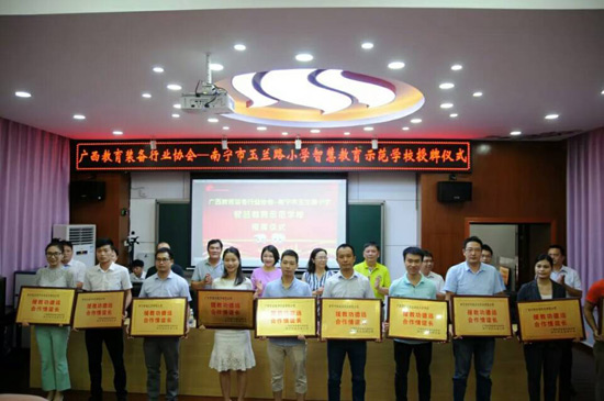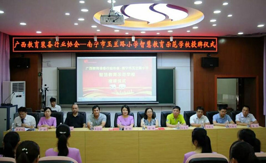 2018年6月27日上午,廣西教育裝備行業(yè)協(xié)會智慧教育示范學校掛牌儀式在南寧玉蘭路小學舉行,標志著南寧市玉蘭路小學新時代教育信息化發(fā)展駛入了快車道,具有里程碑式重要意義。與會領導、全國教育裝備界的各知名企業(yè)代表、愛心人士、家長代表、教師代表,一同出席了活動,見證了這一歷史性的時刻。
