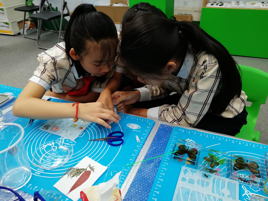 展會(huì)現(xiàn)場-工作人員給來訪人員介紹DIY學(xué)生實(shí)驗(yàn)制作解決方案產(chǎn)品及學(xué)生們展示DIY制作標(biāo)本